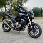 HONDA CB500F ABS, 12636 kms, couleur noir, entretien à jour, carnet et manuel du conducteur, double de clé, garantie et assistance constructeur jusqu’au 10/08/2028, avec silencieux SC-Project, sacoche de réservoir Givi, saute vent fumé ermax, liserets de jantes Honda, chez Doumenq motos.