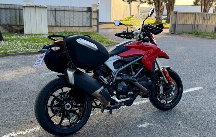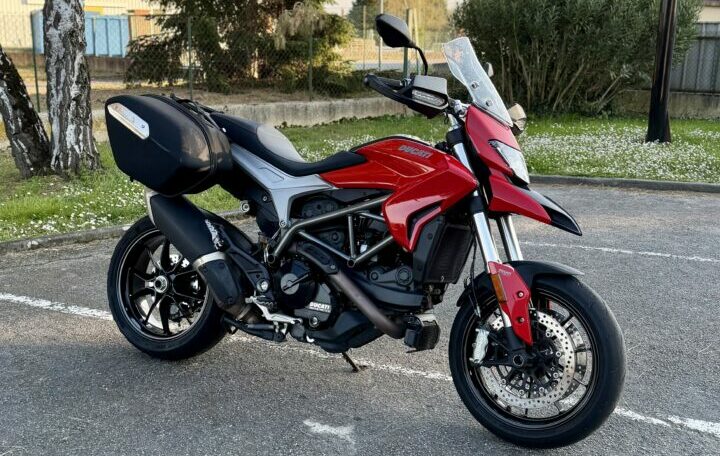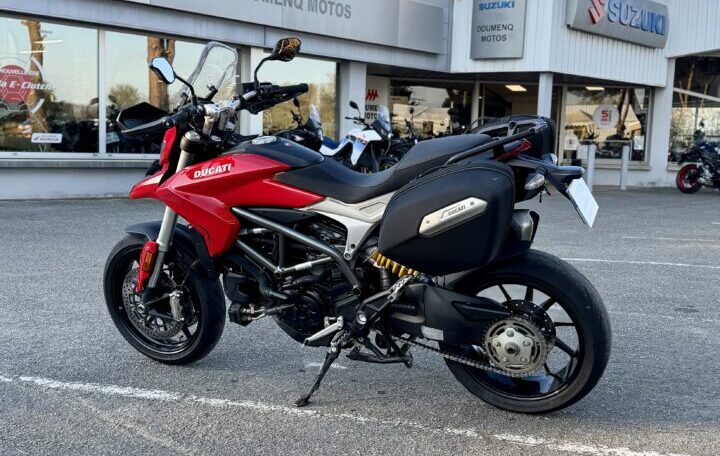 DUCATI 939 HYPERMOTARD, 24614kms, couleur rouge, première main, carnet et manuel du conducteur, double de clé, garantie 1 an en France Métropolitaine, avec valises latérales souples Origine Ducati, chez Doumenq motos.
