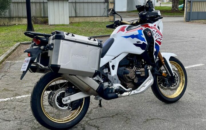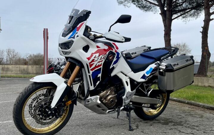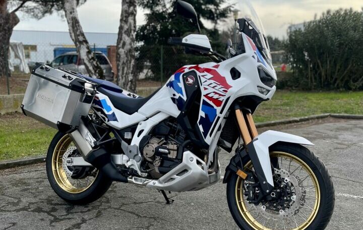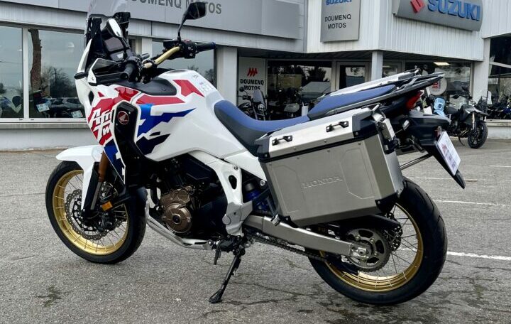 HONDA CRF1100 AFRICA-TWIN ADVENTURE DCT ABS, 1591 kms, couleur tricolore, entretien à jour, carnet et manuel du conducteur, double de clé, garantie et assistance constructeur jusqu’au 24/04/2031, avec Pack valises latérales aluminium origine Honda, chez Doumenq motos,