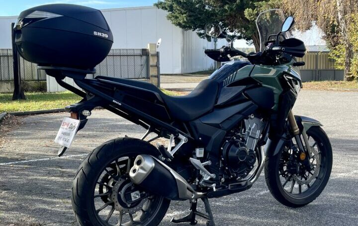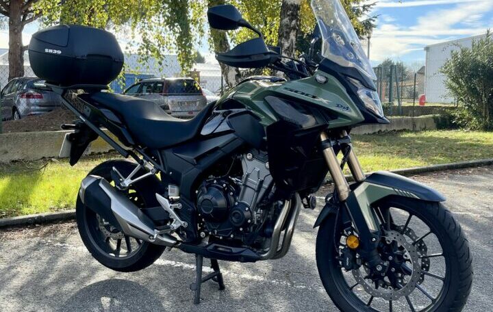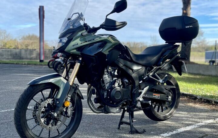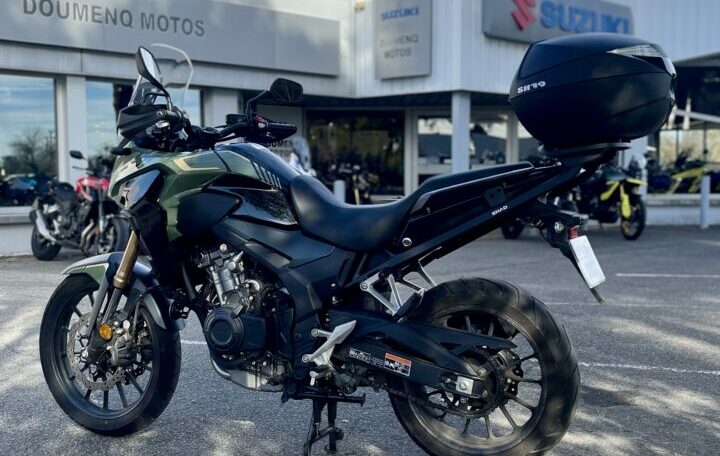 HONDA CB500X ABS, 10392 kms, couleur vert, première main, entretien à jour, carnet et manuel du conducteur, double de clé, garantie et assistance constructeur jusqu’au 04/10/2028, avec Top case Shad 39L, pare mains Givi, béquille centrale origine Honda, chez Doumenq motos.