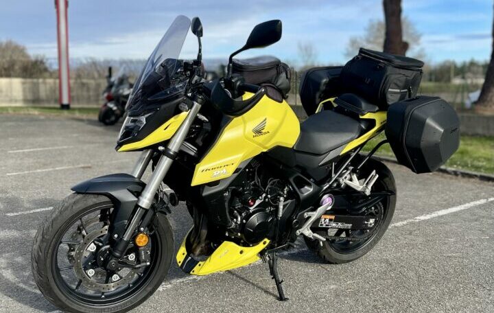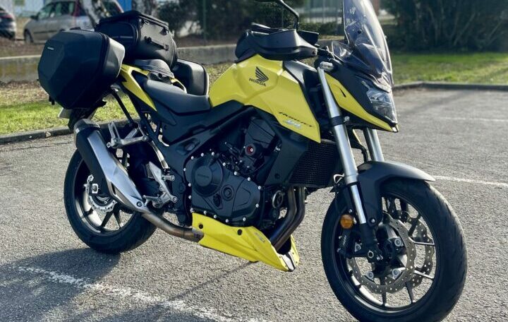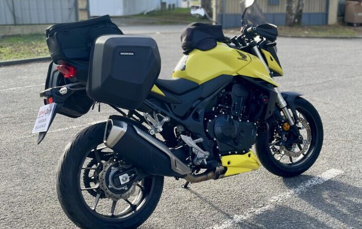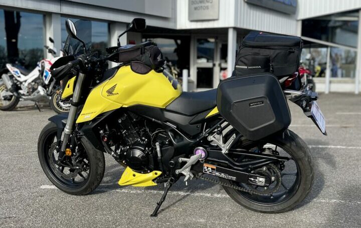 HONDA CB750 HORNET A2 ABS, 13659kms, couleur jaune, première main, entretien à jour, carnet et manuel du conducteur, double de clé, garantie et assistance constructeur jusqu’au 13/11/2028, avec, valises latérales souples Honda, sacoche de selle Honda, garde boue arrière Puig, Quickshifter Honda Up&Down, sabot moteur Ermax, saute vent fumé, pare mains Givi, patins de protections Honda, chez Doumenq motos.