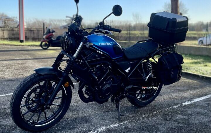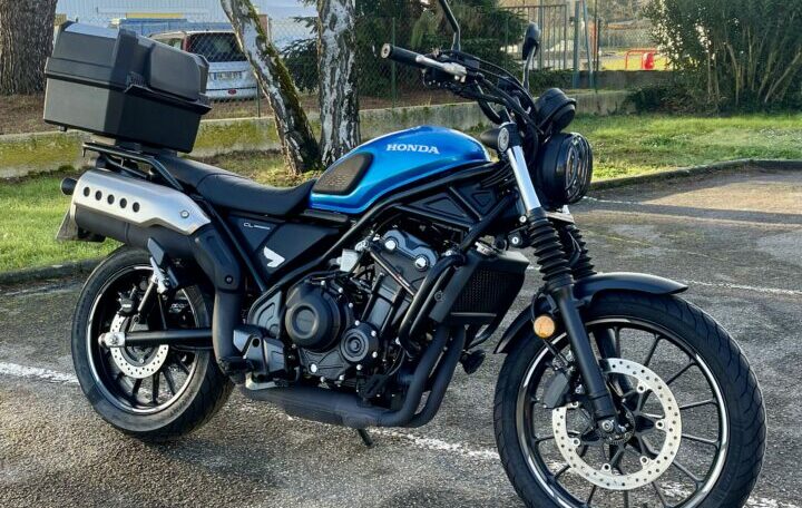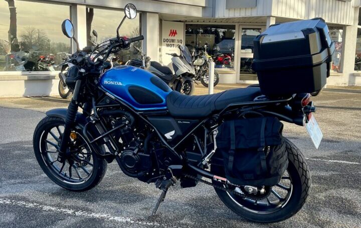 HONDA CL500 ABS, 11315 kms, couleur bleue, première main, entretien à jour, carnet et manuel du conducteur, double de clé, garantie et assistance constructeur jusqu’au 02/11/2028, avec, bulle Touring, protection de phare, poignées chauffantes, pare carters, amortisseurs Hagon, top case origine Honda, valise latérale gauche, liserés de jantes, chez Doumenq motos,