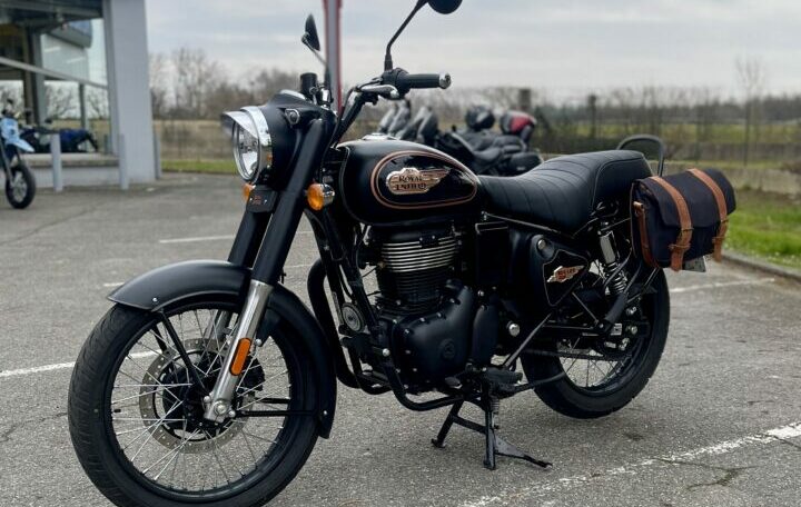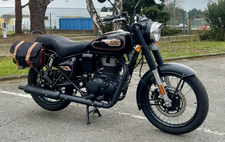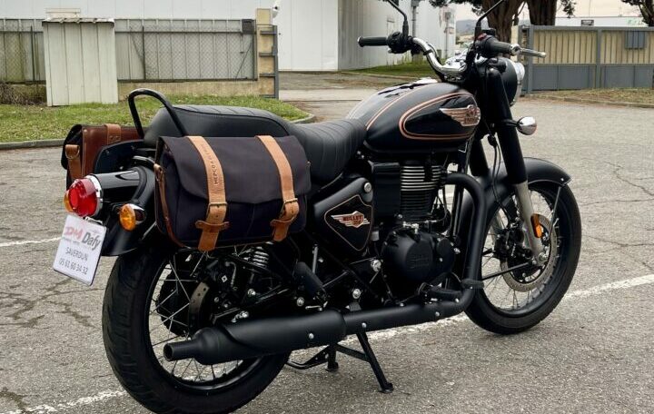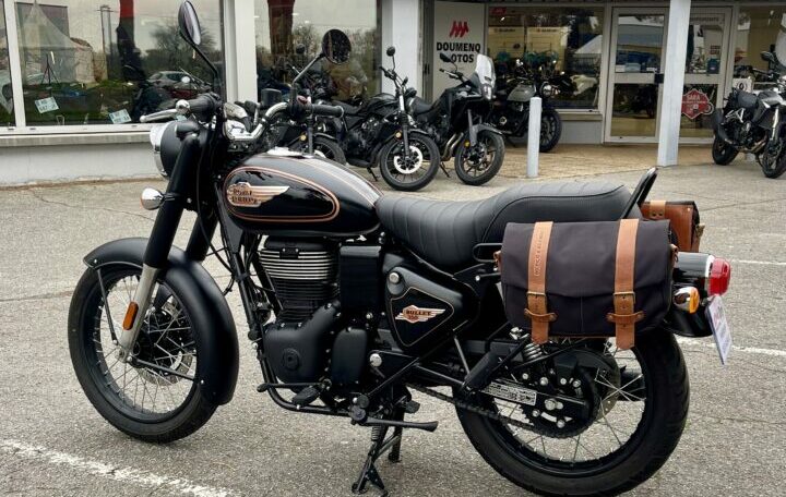ROYAL ENFIELD BULLET 350 ABS, 3440 kms, couleur noir, première main, entretien à jour, carnet et manuel du conducteur, double de clé, garantie et assistance constructeur jusqu’au 29/07/2027, avec valises latérales souples Hepco & Becker, béquille centrale, chez Doumenq motos.