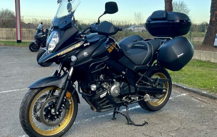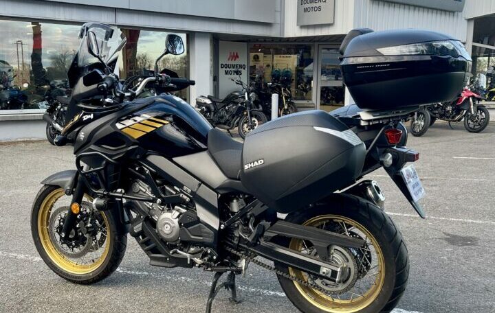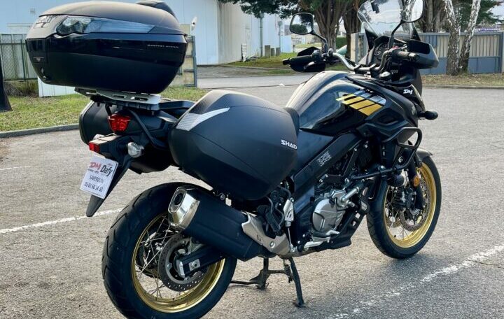 SUZUKI DL650XT A2 ABS, 5003kms, couleur noir/or, entretien à jour, carnet et manuel du conducteur, double de clé, garantie 1 an en France Métropolitaine, avec valises latérales Shad, Top case Origine Suzuki deux casques, selle confort, crash bar Suzuki, feux additionnels Suzuki, bulle touring; béquille centrale Suzuki, chez Doumenq motos.